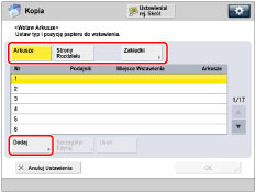 Ustawienia dla wstawianych arkuszy, stron rozdziałowych lub papieru z zakładkami mogą zostać potwierdzone/zmienione po naciśnięciu przycisku [Szczegóły/ Edytuj] i po zaprogramowaniu ustawień.