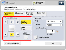 Aby ustawić pozycję drukowania dla tylnej strony podczas przeprowadzania dwustronnego kopiowania, należy wybrać [Przeciwnie do pierwszej str.] lub [Tak samo jak przednia strona] → i nacisnąć na [OK].