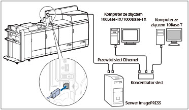 W tym rozdziale opisano połączenie sieciowe przez przewód LAN oraz ustawienia sieciowe wprowadzane na panelu sterowania. Aby uzyskać więcej informacji na temat ustawień sieciowych, patrz instrukcje dostarczone wraz z Serwer imagePRESS.