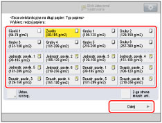 Użytkownik może rejestrować rodzaje papieru, które nie są wyświetlane na liście szczegółowych ustawień opcji Wybierania rodzaju papieru. Aby uzyskać więcej informacji na temat rejestrowania niestandardowych rodzajów papieru, patrz „Rejestrowanie niestandardowych rodzajów papieru.”