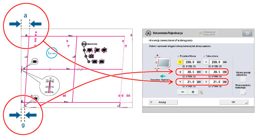 Ustawienie umożliwia korekcję kształtu obrazu poprzez dopasowanie długości od 'a' i 'g' do krawędzi głównej papieru, gdy obraz jest drukowany w postaci równoległoboku.