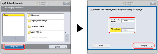 Domyślnie, urządzenie działa w oparciu o ustawienia administratora systemu (NI administratora systemu/PIN). Dlatego też, przed zmianą ustawień administrator musi się zalogować używając do tego celu NI administratora systemu oraz PINu. Domyślnym ustawieniem zarówno dla NI administratora systemu oraz PIN jest '7654321'. Zaleca się zmienić zarówno NI menadżera systemu jak i PIN systemu.