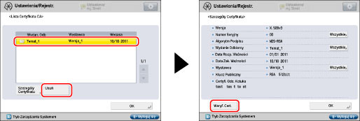 Istnieje możliwość potwierdzenia ustawień zarejestrowanych certyfikatów CA. Istnieje również możliwość usuwania niepotrzebnych certyfikatów CA.