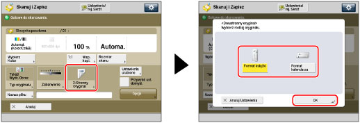 Jeżeli chcesz skanować każdą ze stron dwustronnych oryginałów umieszczonych na szklanej płycie roboczej, należy określić ustawienia [Tworzenie zadania]. (Patrz „Tworzenie zadania.”)