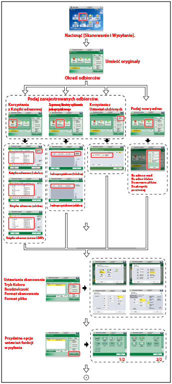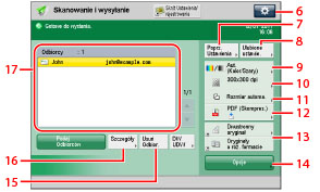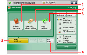 Naciśnij, aby wybrać i korzystać z innych trybów dostępnych dla skanowania i wysyłania. Ustaw przydatne funkcje wysyłania, takie jak wysyłanie oryginałów o różnych formatach lub wysyłanie dwustronnych oryginałów.