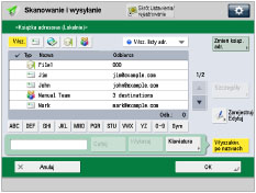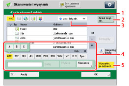 Naciśnij na [Wyszukiw. po nazwach], aby wyświetlić ekran wyszukiwania zgodnie z nazwą odbiorcy. Można zawęzić wyszukiwanie jeszcze bardziej dodając kolejne znaki, rozpoczynając od pierwszego znaku nazwy odbiorcy. Można również sortować wyświetlane adresy poprzez naciśnięcie odpowiednich liter za pomocą [Klawiatura].
