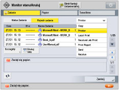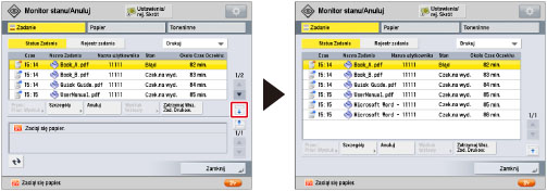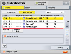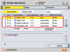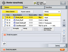 Jeżeli funkcja [Wygasł Czas Wstrzymanego Zadania] w [Ustawienia Funkcji] (Ustawienia/Rejestrowanie) jest włączona, zadanie wstrzymane z powodu braku dostępnego papieru do drukowania wyświetlane jest jako wstrzymane zadanie, po upływie określonego czasu. Aby wznowić wstrzymane zadanie, załaduj papier → wybierz zadanie → naciśnij na [Szczegóły] → [Wznów].