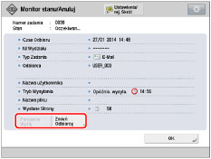 Zmienia odbiorcę. Jeżeli wybrano zadanie, które zostało przesłane dla wielu odbiorców, naciśnij na [Lista rozsyłania] → wybierz odbiorcę, którego chcesz zmienić → i naciśnij na [Zmień Odbiorcę].