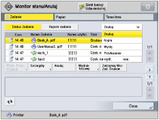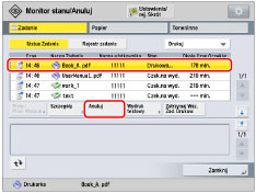 Jeżeli wybierzesz [Drukuj] lub [Kopia] dla rodzaju zadania, możesz ustawić [Zakończono wydruk aktualnej kopii]. Przycisk anuluje wybrane zadanie kopiowania/drukowania po wykonaniu aktualnego zestawu kopii/wydruków.