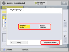Po wyprowadzeniu wydruku próbnego, urządzenie automatycznie rozpocznie przetwarzanie zadania drukowania. Jeżeli potrzebujesz wykonać regulację ustawień, naciśnij na [Anuluj] lub [Zatrzymaj Wsz. Zad. Drukow.] i wprowadź niezbędne regulacje.