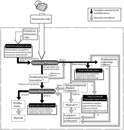 *1 Jeżeli włączona zostanie opcja <Zapisz/Drukuj Odebrany Plik> w [Ustawienia Przekazania], to przekazywane pliki są albo drukowane, albo zapisywane w Skrytce odbioru RX do pamięci. Aby wyświetlić więcej informacji na temat Zapisywania/drukowania odebranego pliku, patrz punkt 14 z