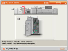 Gdy w urządzeniu zablokują się zszywki, na ekranie dotykowym pojawi się komunikat informujący o miejscu zablokowania oraz sposób usunięcia tych zszywek. Postępować zgodnie z instrukcjami wyświetlanymi na ekranie, aby usunąć zablokowane zszywki. Ekran jest wyświetlany co jakiś czas, aż do usunięcia zablokowanych zszywek. Jeżeli naciśniesz na [Zamknij], można kontynuować pewne operacje (np. programować tryby i funkcje oraz skanować oryginały), i to pomimo tego, że nie nastąpi natychmiastowe wyjęcie zablokowanych zszywek.