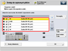 Aby rozpocząć podawanie papieru z Zespół wstawiania dokumentów-N1, wybierz [Podajnik Papieru 1] lub [Podajnik Papieru 2]. Jeżeli papier jest podawany z Zespół wstawiania dokumentów-N1 dla aktualnego zadania, należy nacisnąć na [Zmień podaj- nik1 papier] lub [Zmień podaj- nik 2 papier], aby wybrać papier dla arkuszy rozdzielających zadanie.