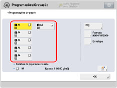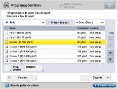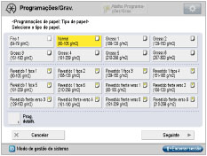 Durante a gravação do tipo de papel personalizado para uma origem do papel, as programações do tipo de papel ficam protegidas, pelo que não pode alterar as informações detalhadas relativas ao tipo de papel personalizado, nem apagar o tipo de papel personalizado em [Programações gestão de tipos de papel] em [Preferências] (Programações/Gravação).