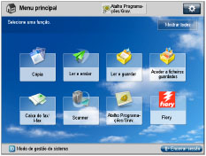 Se [Gestão ID departamento] estiver programada para "Ligado" e se uma função restringida pela opção Limitar funções estiver especificada como ecrã pré-programado, o ecrã Menu principal aparece durante o arranque.(Se [Gestão ID departamento] estiver programada para "Ligado", [Cópia] é restringida pela opção Limitar funções). Para ver a função especificada para o ecrã de arranque pré-programado, selecione a função no ecrã Menu principal → introduza a ID de departamento/PIN no ecrã Inic. sessão.