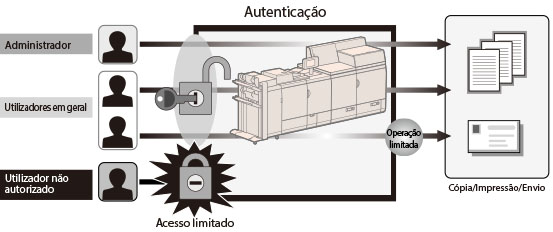 O administrador gere os utilizadores, restringindo o acesso pelos utilizadores em geral e programando restrições a operações através do modo de autenticação. Os privilégios do utilizador em geral podem ser definidos por utilizador.Impedindo o acesso por utilizadores não autorizados, os administradores conseguem reduzir a ameaça de violação da máquina e fuga de informações.