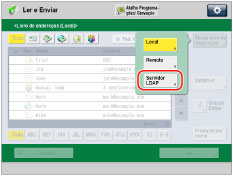 A quantidade de resultados da procura apresentados não excede o limite máximo especificado em [Servidor LDAP]. Se o destino pretendido não aparecer, pode aumentar o número máximo de endereços a procurar ou alterar os critérios de procura. (Consulte "Programações do servidor LDAP".)
