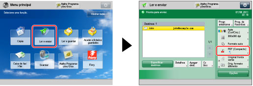Se selecionar PDF ou XPS como formato de ficheiro, pode programar [Compacto] e [OCR (Texto pesquisável)] ao mesmo tempo. Nesse caso, [PDF (Compacto)] ou [XPS (Compacto)] aparece como formato de ficheiro no ecrã de funções básicas de Ler e Enviar.