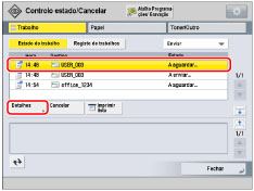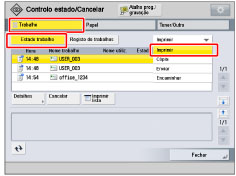 Reenvia o trabalho. Se selecionar um trabalho com vários destinos, carregue em [Lista destinos envio] → selecione o destino para onde pretende reenviar o trabalho → carregue em [Reenviar].