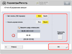 нажмите клавишу [Вкл.], чтобы автоматически распечатывать Отчет об управлении связью, когда количество операций передачи и приема достигает 100.