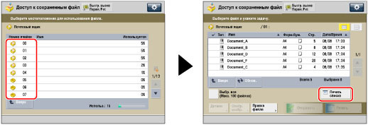 Даже если отсортировать список сохраненных файлов, нажав клавишу [Имя] или [Дата/Время], список файлов печатается в том порядке, в котором файлы были сохранены в почтовом ящике.