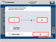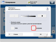 Если выполняется настройка плотности фона с помощью клавиши [Настройка] для параметра <Плотность фона>, настройка [Авто] отменяется. Аналогично, при нажатии клавиши [Авто] во время ручной настройки в пункте [Настройка] выполненные настройки отменяются. Аппарат автоматически настраивает плотность в соответствии с фоном.