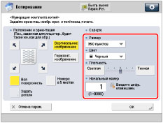 Если задать для параметра [Вариант номера] значение "Вкл.", клавиши [Вся поверх- ность] и [Номера в 5 местах] выглядят серыми и не могут быть выбраны. (См. "Варианты нумерации комплектов копий".)