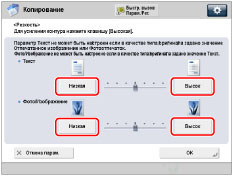 Для четкого копирования текста или линий настройка должна быть ближе к значению [Высок.] для области, содержащей Текст. Для копирования оригиналов, содержащих отпечатанные фотографии или другие полутоновые изображения, настройка должна быть ближе к значению [Низкий] для области, содержащей Фото/Изображения.