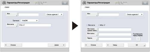 Если язык отображения на сенсорном дисплее отличается от языка компьютера, используемого в качестве главного браузера, [Имя хоста] и [Местонахождение папки] могут отображаться неправильно либо обзор каталогов окажется невозможным.