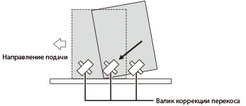 Валик коррекции перекоса находится в узле подачи блока разметки. Он корректирует зарегистрированное положение подаваемой бумаги, проталкивая бумагу по диагонали вдоль стенки внутри устройства подачи. Если настройка уровня коррекции перекоса задана неверно, изображение печатается с перекосом.