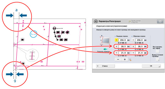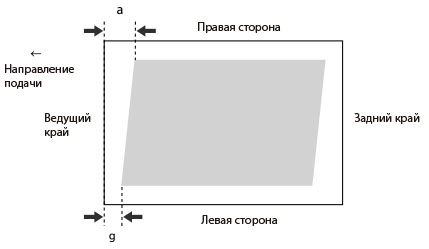 Этот параметр позволяет корректировать форму изображения путем уравнивания расстояния от меток "a" и "g" до ведущего края бумаги, если изображение печатается в виде параллелограмма.
