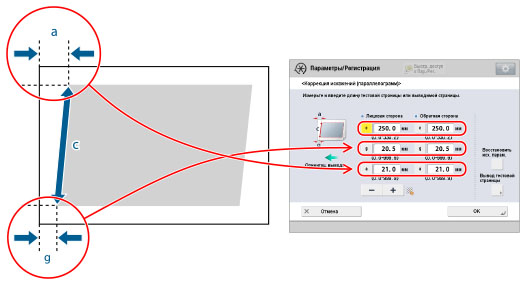 На основании следующих двух числовых значений и "c = 250,0" устройство выполняет настройку длины для коррекции искажения в области печати.