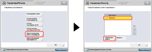 Нажмите клавишу [Зарегистрировать ключ и сертификат] → выберите регистрируемый файл → нажмите клавишу [Зарегистри- ровать].