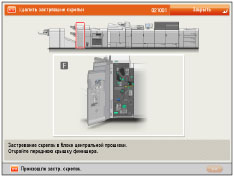 Если произошло застревание скрепок, на сенсорном дисплее отображается экран, показывающий, где произошло застревание, с указаниями по устранению застревания скрепок. Следуйте указаниям на экране для устранения застревания скрепок. Экран периодически отображается до тех пор, пока не будет устранено застревание скрепок. Нажав клавишу [Закрыть] можно продолжать выполнение некоторых операций по настройке режимов или сканированию оригиналов даже в том случае, если застревание скрепок не устраняется немедленно.