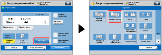 Для того чтобы бумага подавалась из модуля Устройство вставки документов N1, выберите вариант [Устройство вст.листов 1] или [Устройство вст.листов 2]. Если для текущего задания бумага подается из модуля Устройство вставки документов N1, нажмите клавишу [Изменить бу- магу д. вст.1] или [Изменить бу- магу д. вст.2], чтобы выбрать бумагу для вставки листов.