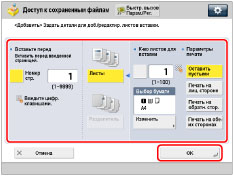 Нельзя одновременно выбрать несколько файлов и указать параметры вставки листов для этих файлов. В этом случае нужно установить режим Разделитель заданий. (См. "Разделитель заданий".)