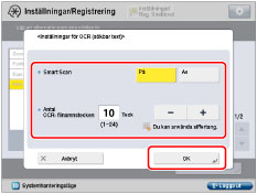 Tryck på [På] för <Smart Scan> → tryck på [-] eller [+] för <Antal OCR- filnamnstecken> för att ange antalet tecken för filnamnet → tryck på [OK].