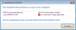 ![]() Wenn ein Plug & Play Bildschirm zur automatischen Installation, wie unten abgebildet, nach Anschließen des USB-Kabels angezeigt wird, klicken Sie auf [Schließen] oder [Abbrechen], um ihn zu schließen.