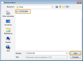Especifique la carpeta donde se encuentra el controlador de impresora, seleccione el archivo Inf y haga clic en [Abrir].