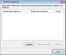 Si hace clic en [Limpiar], se eliminarán todos los archivos, la información sobre directorios y otros datos relacionados con todas las impresoras, no solo de la impresora seleccionada, sino de todas las que aparecen en la lista. Lo normal es que utilice [Eliminar] para desinstalar los controladores de impresora. Haga clic en [Limpiar] cuando no haya impresoras en la lista.