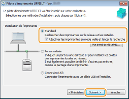 Sélectionnez [Standard], cochez la case [Réactiver les imprimantes en mode veille et lancer la recherche] puis cliquez sur [Suivant].