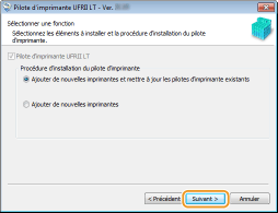 Si un pilote d'imprimante est déjà installé, l'écran [Sélectionner une fonction] s'affiche avant l'écran [Sélectionner les imprimantes à installer]. Pour votre imprimante, le choix que vous faites ici ne fait aucune différence en ce qui concerne le processus de configuration. Vous n'avez qu'à cliquer sur [Suivant]. ![]() Si l'onglet [Périphériques IPv6] ne s'affiche pas