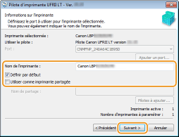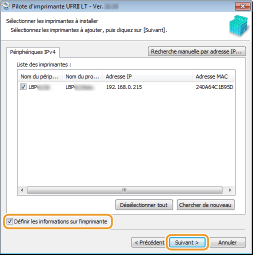 Cochez la case [Définir les informations sur l'imprimante], puis cliquez sur [Suivant].