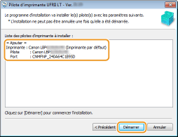 Vérifiez les informations sur l'imprimante dans [Liste des pilotes d'imprimante à installer], puis cliquez sur [Démarrer].