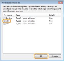 Il peut arriver qu'il ne soit pas possible d'installer les pilotes d'imprimante via le réseau si les ordinateurs clients et le serveur d'impression utilisent différentes versions du système d'exploitation (32 ou 64 bits).
