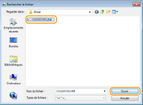 Spécifiez le dossier contenant les pilotes supplémentaires, sélectionnez le fichier Inf, puis cliquez sur [Ouvrir].