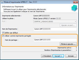 Si vous sélectionnez cette option, l'ordinateur sur lequel vous installez le pilote d'imprimante est défini comme serveur d'impression. [Nom de partage]