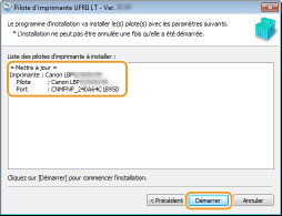 Vérifiez les informations sur l'imprimante dans [Liste des pilotes d'imprimante à installer], puis cliquez sur [Démarrer].