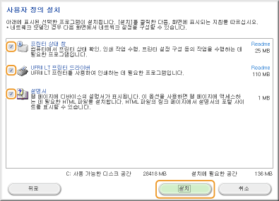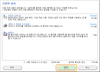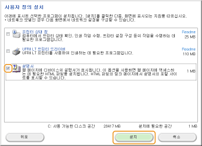 사용자 안내서의 바로 가기 아이콘이 표시되지 않는 경우(즉, 설치된 프린터의 아이콘만 표시될 경우) 사용자 안내서의 포털 사이트 표시를 위한 파일을 따로 설치하기 위한 절차를 수행합니다.