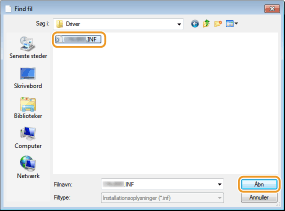Angiv mappen, hvor printerdriveren er gemt, vælg Inf-filen, og klik på [Åbn].